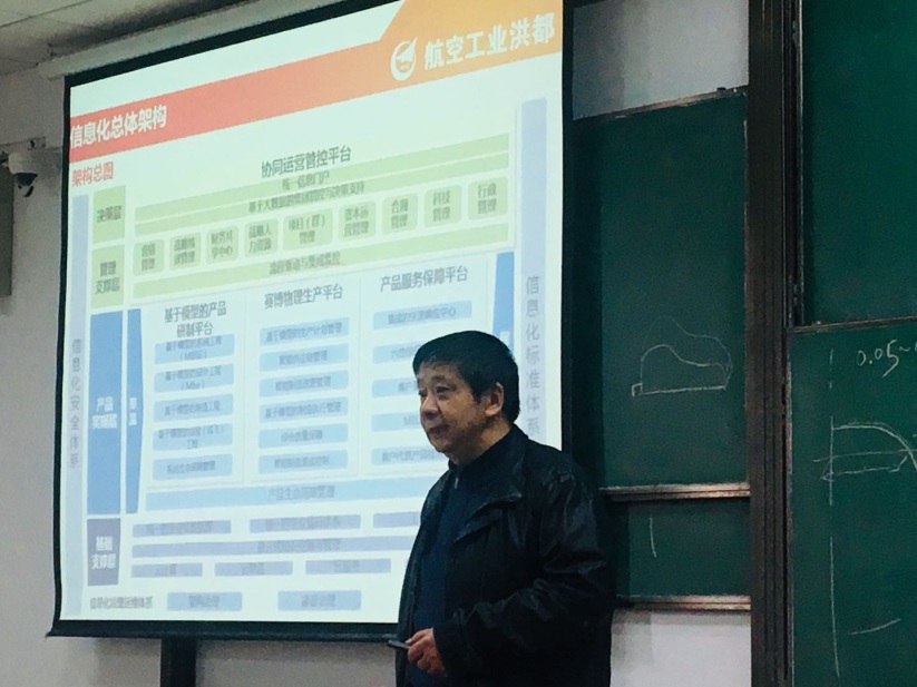 宋总在介绍洪都航空工业集团发展历史和历年航空人为航空事业所做成绩的基础上,向对飞机制造尚懵懵懂懂的大一学生解说了航空厂飞机设计与制造的过程,用实例阐述了数字化技术在飞机设计制造中的应用,以及智能制造在航空厂的发展现状和趋势,宋总讲述清晰,辅以实例说明,现场不时响起同学们的热烈的掌声。