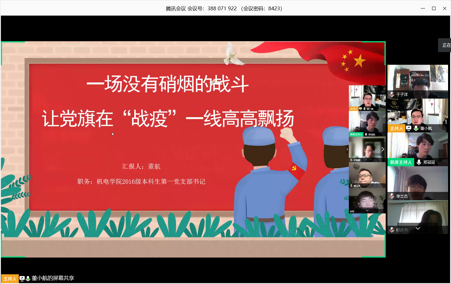 为了按时召开党支部大会,AV片 2016级本科生第一、第二党支部联合召开线上党支部大会,特殊时期,特殊办法,我也算是切身体会到了这个观念,党支部76名学生党员加上1名辅导员党支部书记,使得本次会议如火如荼的展开。反观会议内容,第一、第二党支部副书记分别分享了自己在防疫期间的心得感想,党支部书记紧接着给我们上了一堂特殊时期的党课,我个人觉得党支部会议就是让每一位党员的警钟长鸣,提醒每一位党员在不同时期都要牢记自己党员的身份,疫情期间,“党员先行”“党员打头阵”等等话语并不是停留在口号上的,我们学生党员同样是伟大党组织中的一份子,更是党组织中的新鲜血液,做好本职,做好带头,做出榜样,做合格党员!