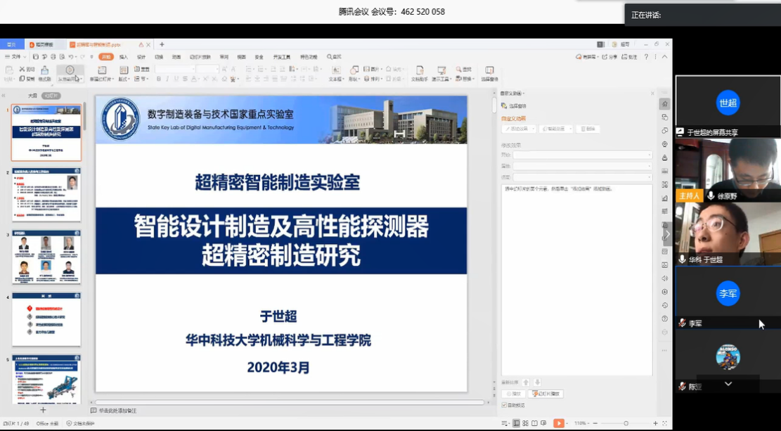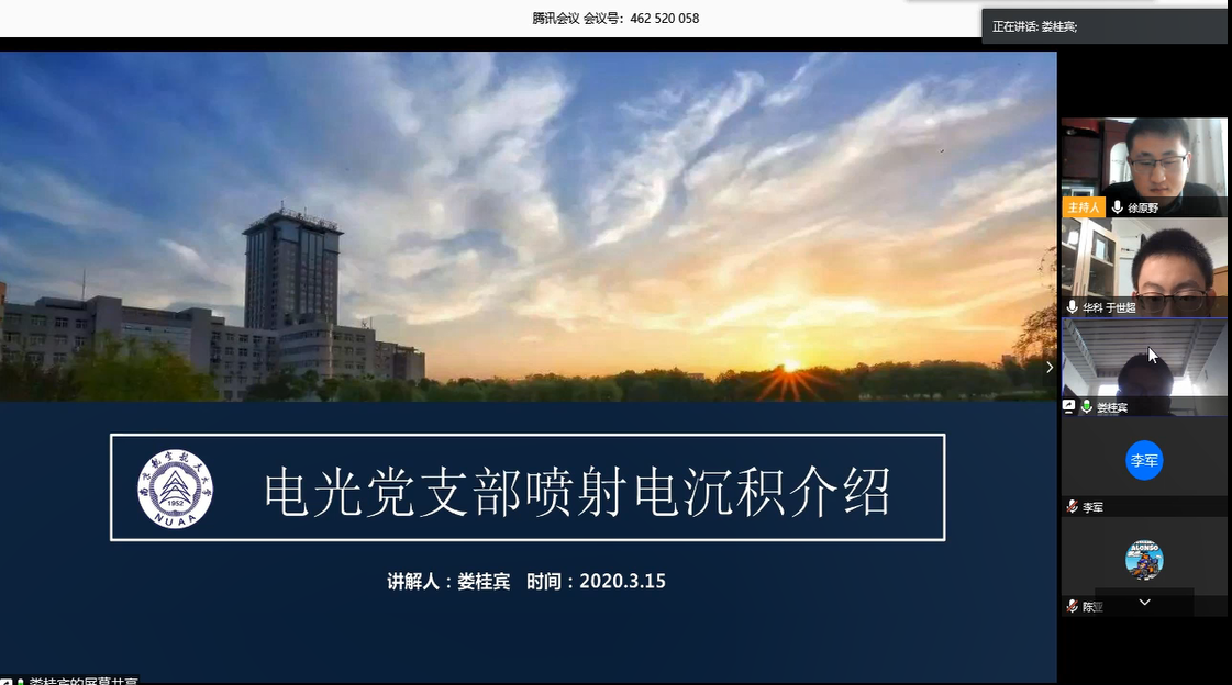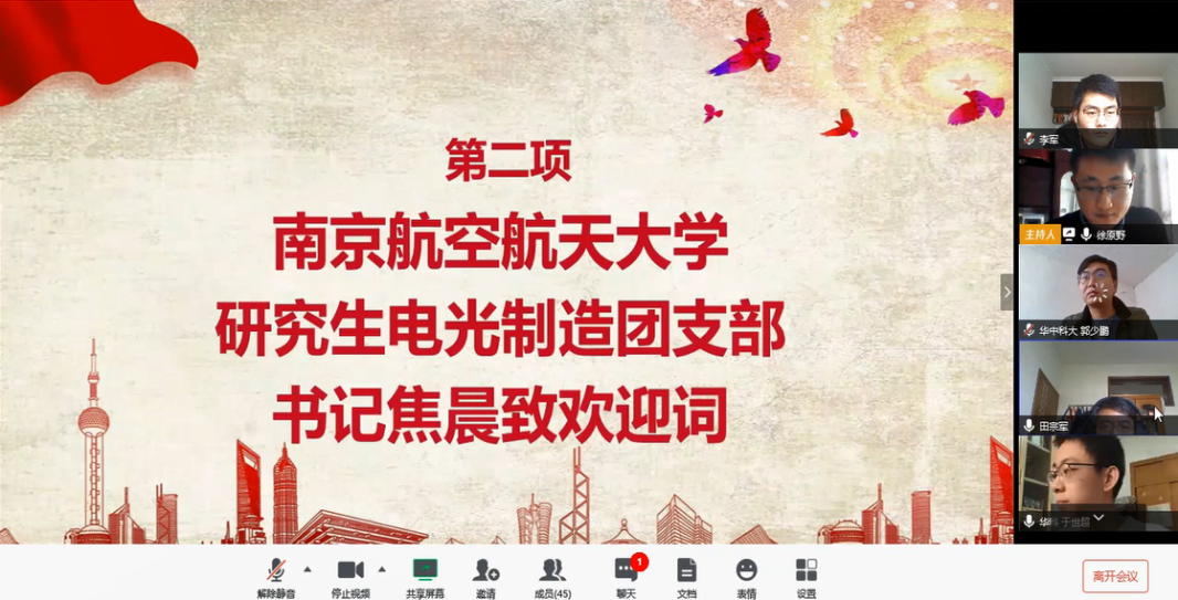 本次联合团日活动依托腾讯会议平台在线上开展。参与此次团日活动的包括华中科技大学机械科学与工程学院硕士1906团支部团员和与AV片 研究生电光制造团支部团员,活动还邀请了电光制造团队田宗军教授、沈理达教授和邱明波副教授观摩指导。本次活动由电光制造团队徐原野主持,活动内容共分为五项。