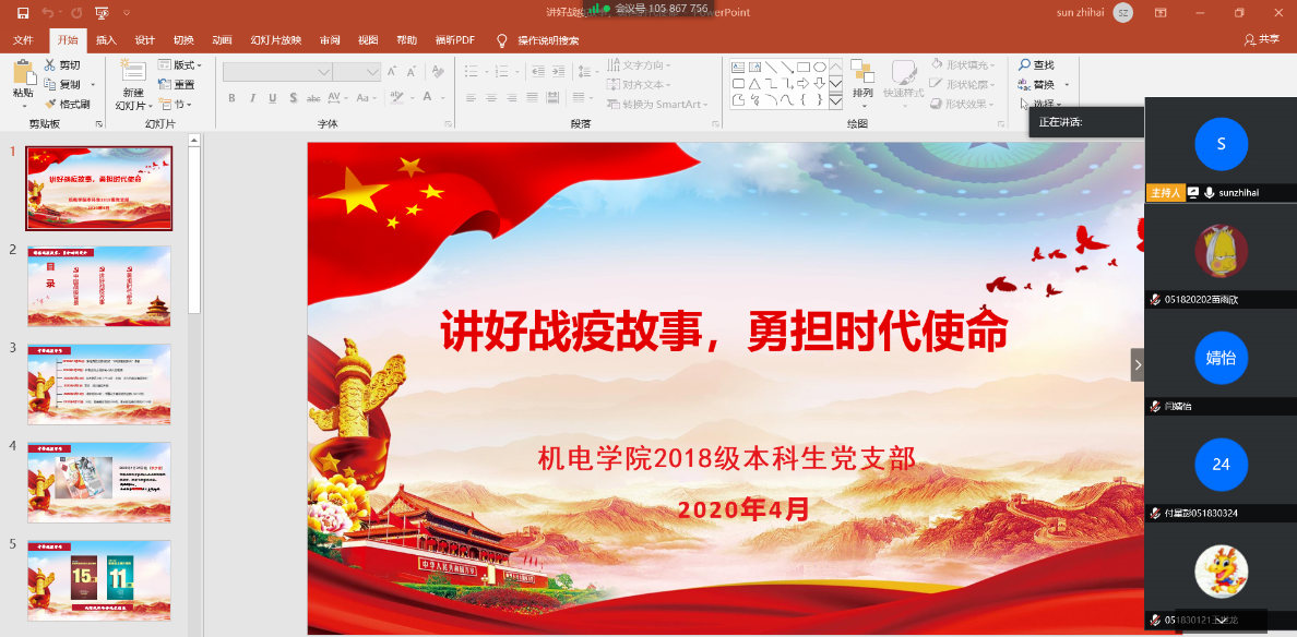 疫情当前,党员先行。为推进疫情防控期间党支部的思想建设工作,加强支部党员的思想引领教育,鼓励支部党员为疫情防控贡献青春力量,4月18日晚,AV片 2018级本科生党支部通过腾讯会议平台,开展“讲好战‘疫’故事,勇担时代使命”专题“云”党课。
