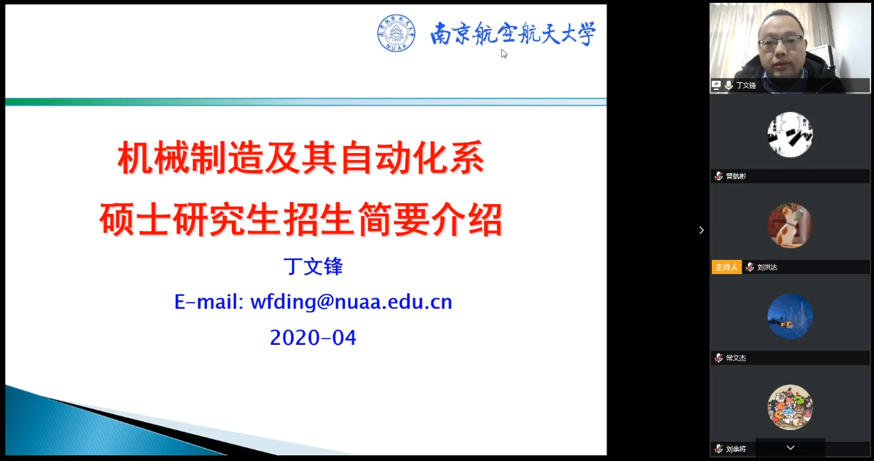 为进一步扩大学科影响,提升学院研究生生源质量,营造浓厚的深造氛围,4月20日到5月12日,AV片 2017级成功开展了4次线上系部大讲堂活动。本次大讲堂活动邀请到了设计工程系副主任郭勤涛、机械制造及其自动化系副主任丁文锋、机械电子工程系副主任陆永华和航空宇航制造工程系副主任鲍益东作为主讲人,采用线上会议的方式为AV片 学生介绍科研团队、研究方向等内容。本次系列活动由2017级本科生辅导员刘洪达主持。