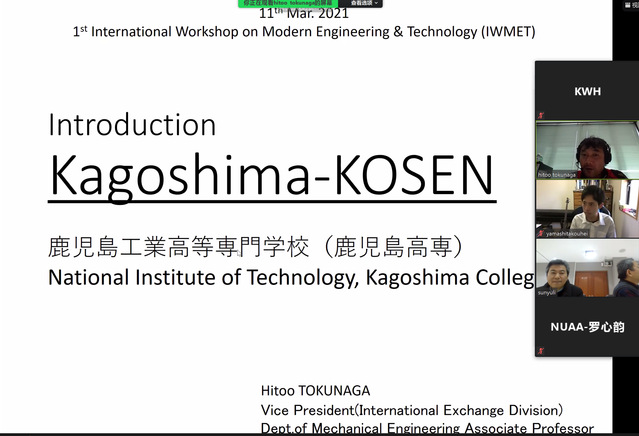 3月11日上午,“1st International Workshop on Modern Engineering & Technology (1st IWMET)”线上本科毕设答辩会议在明故宫校区15号楼341会议室举行。日方参加此次会议的主要人员有:分管国际交流的副校长H. Tokunaga教授及K. Shimana教授、Y. Kobaru教授、Y. Kawano教授等,本科生Tomoyuki Hirotani和Kouhei Yamashita等10余人;AV片 参会的主要人员有:左敦稳教授、孙玉利教授以及部分研究生、大四年级本科生10余人。会议由日本鹿儿岛工学院副校长Hitoo Tokunaga教授主持。
