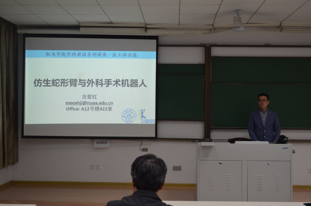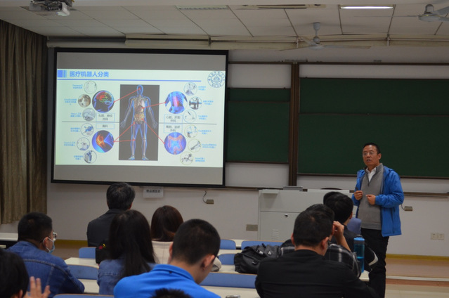 吉爱红教授从目前人工手术方式和医疗机器人手术的对比出发,向同学们展示了医疗机器人手术的优势,进而引出仿生机器人的概念,通过模仿动物、昆虫、鱼类等生物的结构、形态和控制原理,设计具有生物特征的机械结构以实现工程应用所需的机械功能。