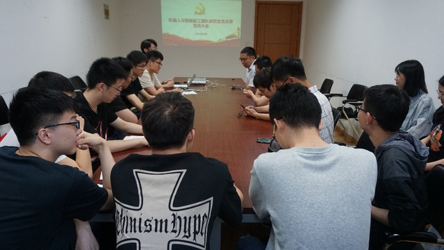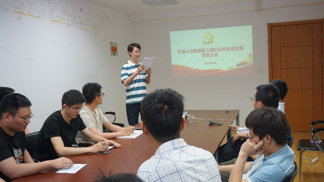 6月4日下午,中共AV片 机器人与智能医工团队研究生党支部第一次党员大会在明故宫校区A17号楼召开。机器人与智能医工团队的陈柏老师、王灵禺老师、刘凯老师、鞠锋老师、姚佳烽老师、吴青聪老师、王旦老师以及团队全体研究生党员参加了本次会议,会议由机器人与智能医工团队研究生党员常天佐同志主持。