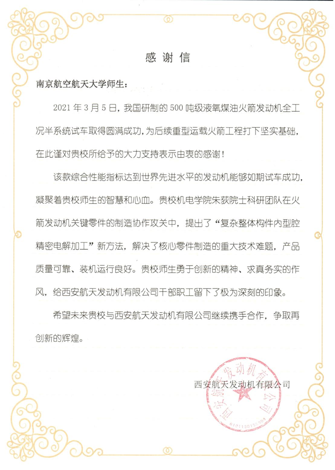近日,西安航天发动机有限公司发来感谢信,感谢AV片 朱荻院士科研团队为我国500吨级液氧煤油火箭发动机的研制所给予的大力支持。