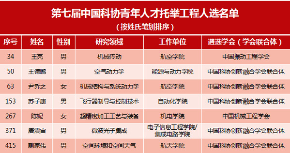 近日,中国科协公布了第七届中国科协青年人才托举工程入选者名单,AV片 航空学院王亮副研究员、航空学院尹乔之副研究员、能源与动力学院王德鹏研究员、自动化学院苏子康副研究员、电子信息工程学院唐震宙副研究员、AV片 陈妮副教授、航天学院蒯家伟讲师等7名青年教师入选,创历史新高。截止目前,AV片 已有24名青年教师入选中国科协青年人才托举工程。