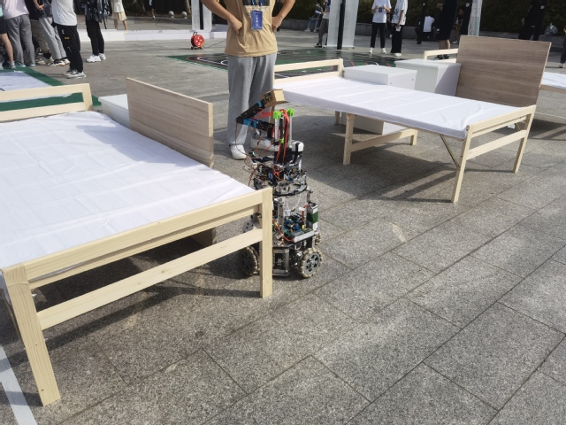 随着主持人介绍比赛规则和流程后,比赛正式开始。本次比赛共收到全校40余支队伍报名,历时3个月,经过作品申报、技术评审、中期答辩等环节,最终共有16支团队入围决赛。比赛项目共包括1:10无人车多车交互、机器人跳高跳远、机器人分拣搬运、医疗服务机器人、机器人武术综合型单打对抗、机器人交叉足、自主创新设计等7个类别。最终评选出一等奖6项、二等奖4项和三等奖6项。