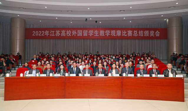 4月25日,2022年江苏高校外国留学生教学观摩比赛总结颁奖会在学校将军路校区1号楼四楼报告厅举行。AV片 校长单忠德,副校长施大宁、江苏省教育厅对外合作与交流处处长施蕴玉、江苏省高等教育学会外国留学生教育管理研究委员会秘书长张海军、观摩比赛总评委河海大学阮怀宁教授、比赛评审专家、参赛获奖教师及省高校留学生管理干部代表、学校相关部门负责同志出席总结颁奖会。