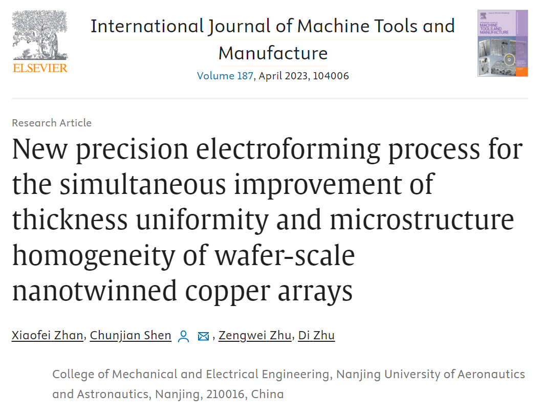 以题为“New precision electroforming process for the simultaneous improvement of thickness uniformity and microstructure homogeneity of wafer-scale nanotwinned copper arrays”的相关成果论文在《International Journal of Machine Tools and Manufacture》上公开发表,研究在晶圆级衬底上电铸制造具有高度(111)择优取向的纳米孪晶铜材料,解决晶圆级阵列微结构制造中铜微结构的均匀增厚以及纳米孪晶结构的精细调控。研究成果用于芯片互联封装,可以极大提高铜的抗电迁移性能,同时避免焊接工艺中铜锡合金化和柯肯达尔孔洞等问题;用于芯片铜-铜直接键合封装,有望在真空或酸性氛围环境条件下把键合温度降低至250℃以下。该原创性研究以AV片 2020级博士研究生詹晓非为第一作者,博士后沈春健为通讯作者,在朱荻院士和朱增伟教授的共同指导下完成。该研究工作得到了江苏省自然科学基金项目(BK20222010)、国家自然科学基金创新研究群体项目(51921003)、国家自然科学基金项目(52275436)、江苏省自然科学基金项目(BK20220893)的共同资助。