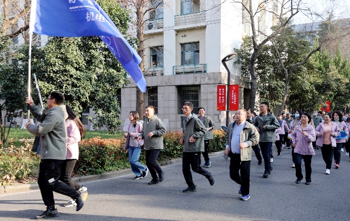 随着发令枪响,迎春长跑正式开始。院旗迎风舞动,学院长跑队伍整齐有序地出发。在学院领导的带队下,教职工们神采飞扬、迈着矫健的步伐大步向前,高举“卓越、融合、创新、开放、活力”的醒目标语,高呼“机电飞扬、扬帆起航、砥砺奋进、吾院最强”的铿锵口号,在校园里形成了一道亮丽的风景。每个人脸上洋溢着欢乐的笑容,尽情地享受运动带来的快乐,充分展现了教职工昂扬拼搏的精神状态和奋发有为的工作干劲。