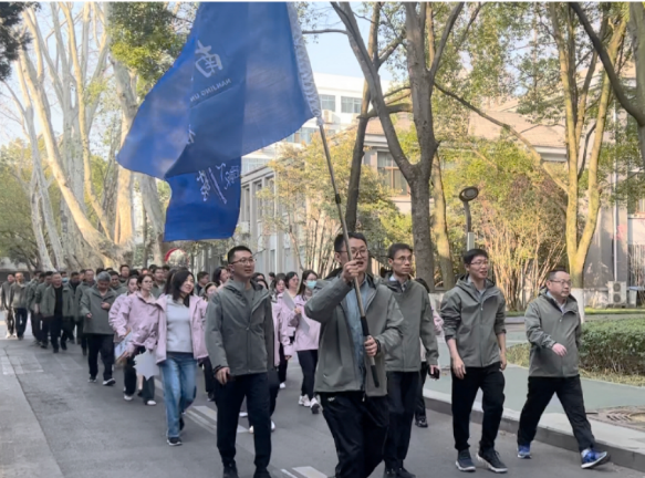 教职工们齐聚学院楼下,身着统一服装,热情洋溢、精神抖擞地列队前往操场集合,展示了团结进取、蓬勃向上的精神风貌。