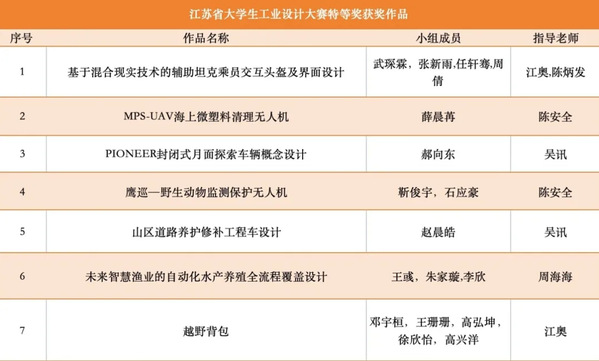 该赛事在教务处“一专业一竞赛一品牌”的支持下,校内竞赛等级为二级乙等,由AV片 负责校内组织,共有来自AV片 、航空学院、自动化学院、长空学院、民航学院、艺术学院等159名研究生和本科生组成的142支参赛团队参加本次赛事。在前期校赛过程中,全校共38个作品获奖,其中一等奖3项、二等奖5项、三等奖10项、优秀奖20项,参赛作品创造了AV片 自参加该赛事以来最多数量,充分调动了全校各专业学生跨学科参赛的积极性,促进了江苏省大学生工业设计大赛的作品质量。