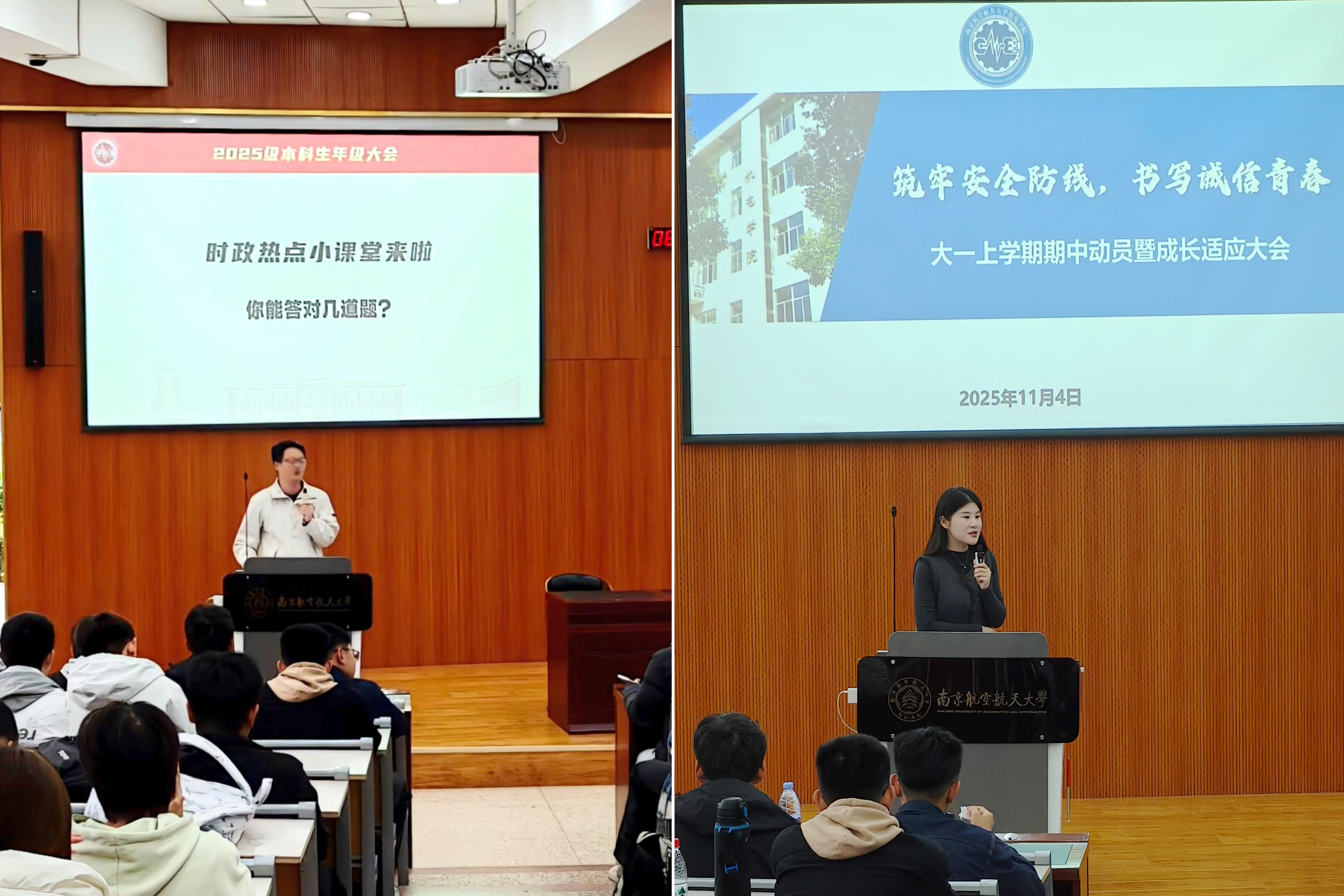 为帮助大一新生平稳适应大学生活、牢固树立诚信意识,11月4日,AV片 召开“筑牢安全防线,书写诚信青春”2025级本科生期中动员暨成长适应年级会。AV片 党委副书记赵铮、校保卫处保卫办主任李广、辅导员聂敏敏、苑君陶,全体2025级新生共同参与会议。