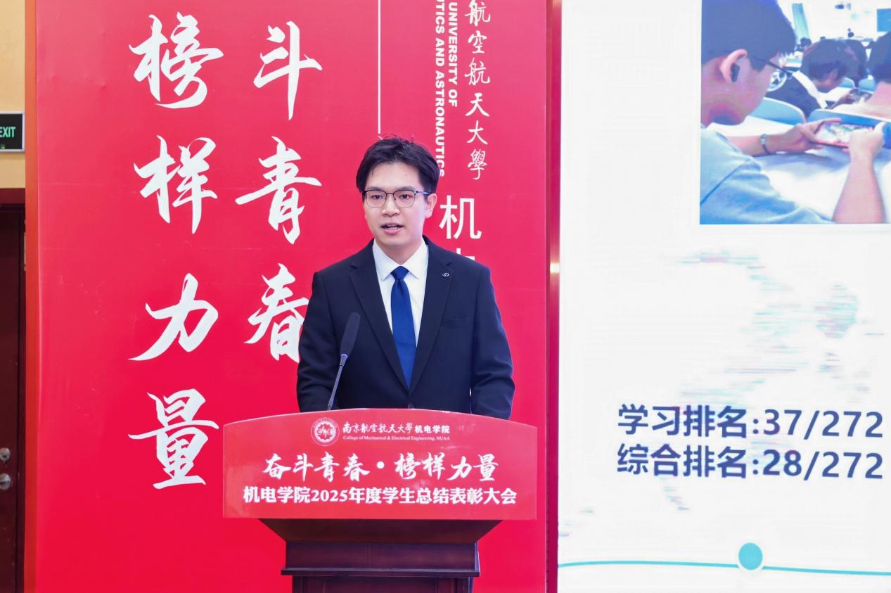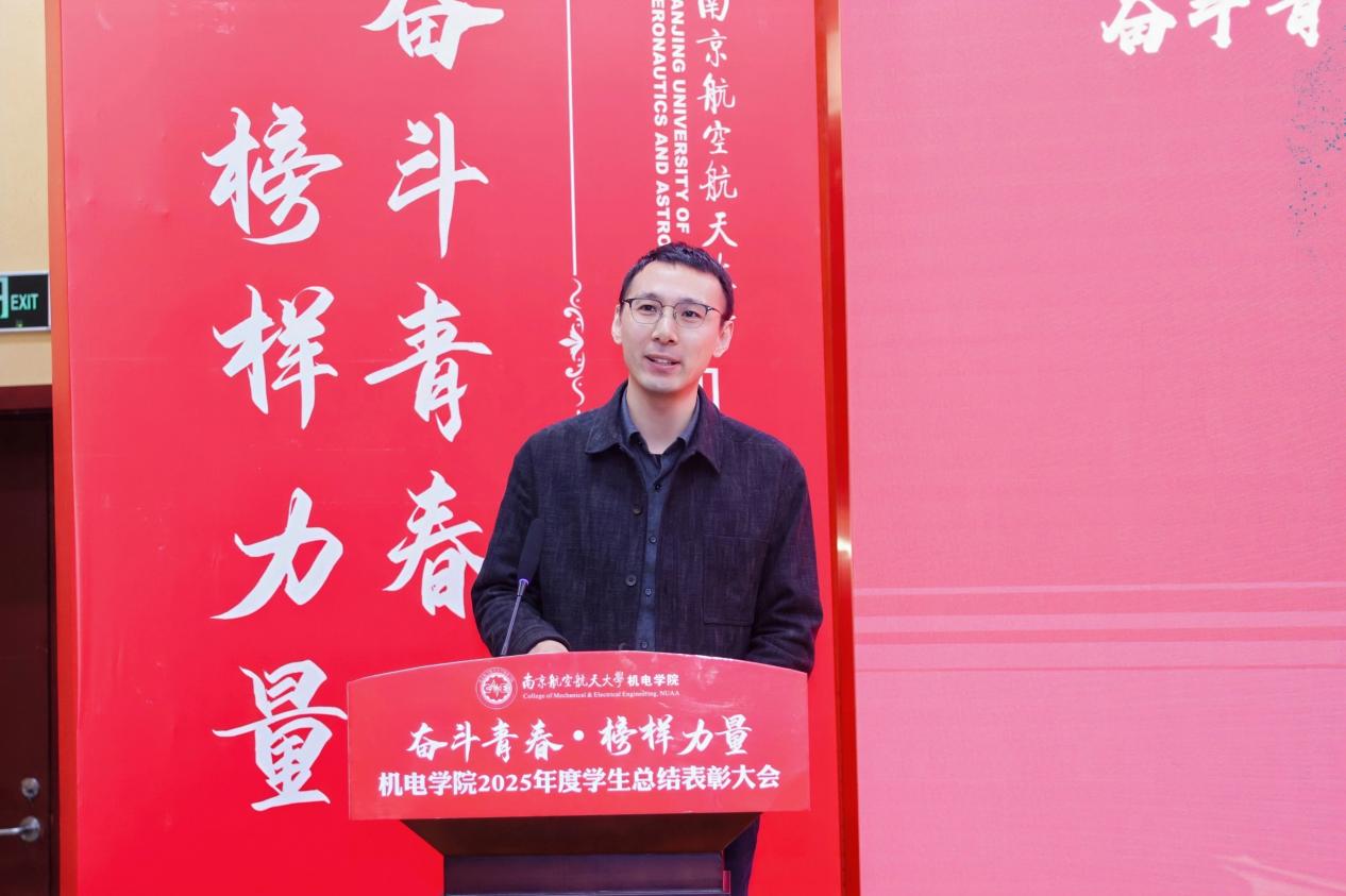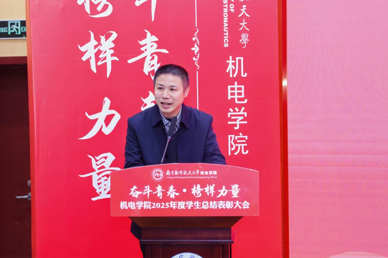 大会最后,AV片 党委书记刘虎作总结讲话。他代表学院向获奖集体与个人表示祝贺,向设奖单位及校友表示感谢。刘虎书记指出,本次大会既是一次榜样事迹分享会,也是一堂生动的思政公开课。他勉励全体机电学子要铸牢信仰之基,将个人理想融入国家航空航天事业大局;要锤炼过硬本领,勇于攀登科技高峰,助推高水平科技自立自强;要永葆奋斗之姿,勇担时代重任,在推进强国建设、民族复兴的伟大实践中书写无愧于时代的青春篇章。