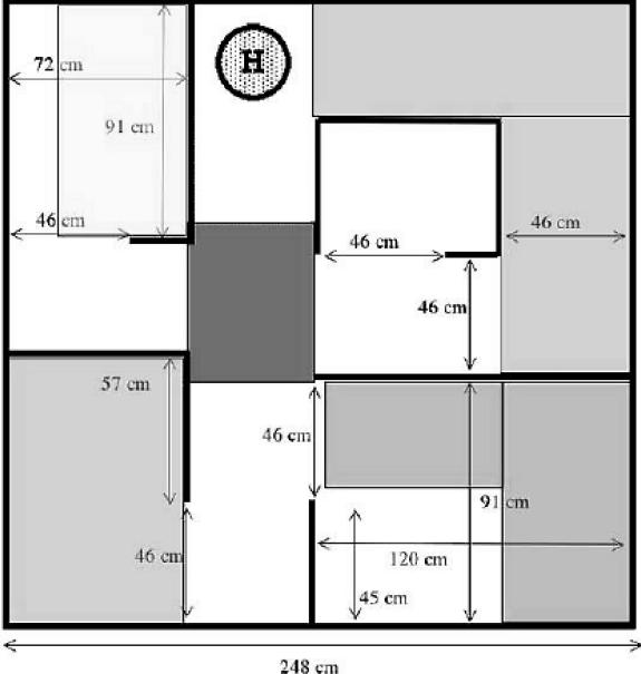 比赛场地将采用国际标准比赛场地,其具体的尺寸如下图。比赛场地的墙壁高33cm,由木头做成。墙壁刷成白色。比赛场地的地板是被漆成黑色的光滑木制板。在所有的房间和走廊的地板上,可能会铺有小地毯,不会有粗毛地毯。场地中所有的走廊和门口都是46cm的开口,将会有一个白色的2.5cm宽的白色带子或白漆印迹表示房间入口。