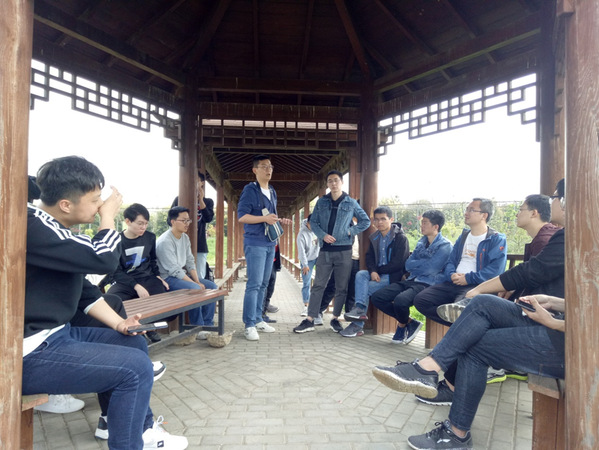 下午2点钟,室外班会开始。本次班会的主题是“考研好还是工作好?”休息亭中同学们围坐一团,听班主任齐振超老师和几位学长分享关于考研和找工作的经验。首先三位学长分别围绕着“选择考研还是工作?”“如何准备考研?”“如何找到合适工作?”等问题,提出了自己的观点和经验之谈。学长们诙谐的话语引发了同学们的积极提问,不少同学就自身情况提出问题请教,学长们和齐老师依次详细解答,在场同学皆有所得。班主任齐振超老师在几位学长发言后,对于考研和工作的利弊进行了总结,教育同学们一定要从自身情况出发,认真考虑如何选择考研和工作,引起同学们的深思。同时齐老师也和同学们分享了自己关于考研和工作的有趣经历,让同学们在笑声不断的同时有所收获。茶话会的最后,齐振超老师希望同学们不要骄傲自满于已有荣誉,要以江苏省优秀班级为起点,继续努力,力争上游。