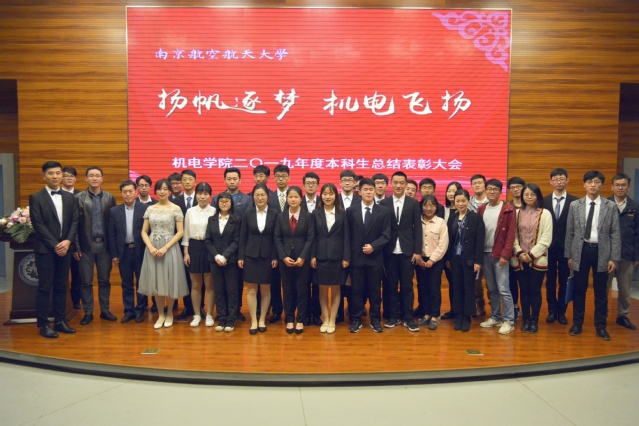 最后,大会进入颁奖环节。学院院长傅玉灿宣读《南京航空航天大学机电学院关于表彰2018-2019学年优秀本科生个人、集体的决定》,企业代表、学院领导、教师代表为优秀个人及集体颁发荣誉证书。随后,学院党委书记袁智强进行了点评。他表示,今年是五四运动爆发100周年,青年一代肩负着实现中华民族伟大复兴的中国梦,在国家实施制造强国战略的时代机遇下,机电学子使命重大,责无旁贷,应当树立远大志向、找准发展航向、把握时代走向、确立成才导向,一棒接着一棒跑,一茬接着一茬干,为实现制造强国而努力奋斗。