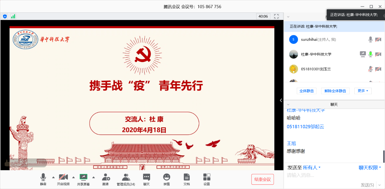 本次党课还特别邀请到华中科技大学研究生党务中心副主席、2019级博士研究生杜康同志讲述他身边的战“疫”故事,杜康同志以“携手战‘疫’,青年先行”为主题,分享了他身为一名武汉在读学生的切身感受,从学校、支部和个人三个方面,呼吁支部党员要矢志成为有理想、有本领、有担当青年先锋。