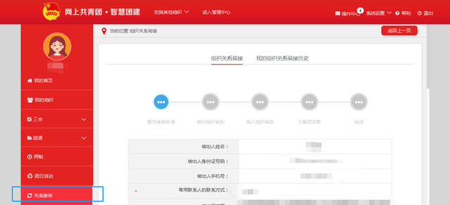 2. 进入个人主页后,点击关系转接,标*的都是必填项,具体操作步骤如下图。