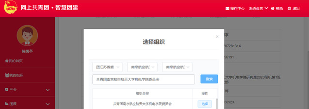 上图选择组织中三个选项分别选择“团江苏省委”,“南京航空航天大学团委”,“南京航空航天大学机电学院团委”,在搜索框里填写“共青团南京航空航天大学机电学院委员会”进行搜索。