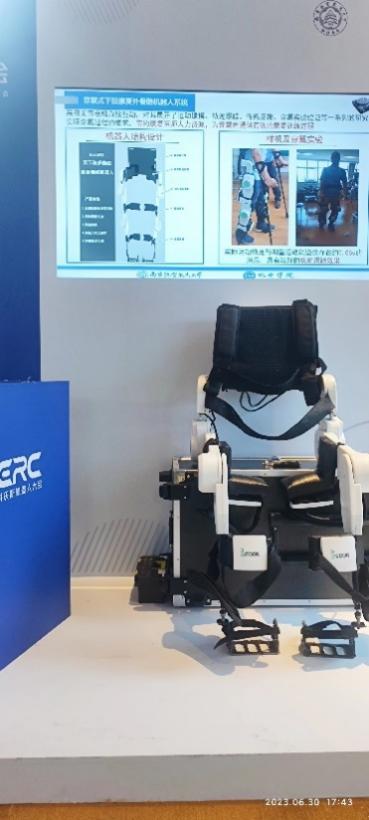 团队还展出一款外骨骼机器人。该机器人基于“神经可塑性”理论,通过采集患者运动的步态信息,研判用户运动意图,并分析学习其步态特征;配备了自主研发的高性能驱控一体化电机,双下肢系统重12kg,最大步数速1.5m/s,能为下床活动的康复患者提供步行训练的机会,充分利用黄金康复时间;适用于由脊髓损伤、脑卒中、下肢肌无力或其他神经系统疾病导致的下肢运动功能障碍患者,在医疗机构、康复机构、学校、社区以及居家等场景下都可以应用。