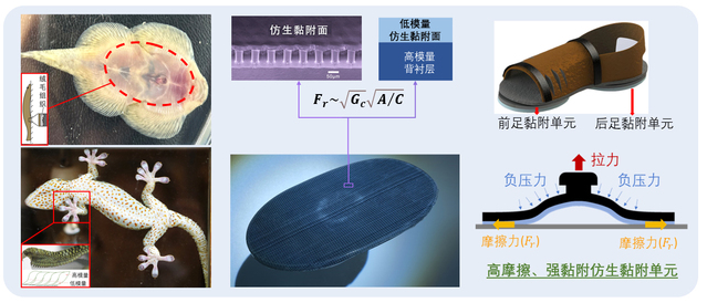 自然界具有攀爬能力的生物为上述问题的解决提供了思路。2017年,我院戴振东教授、姬科举副教授团队联合中国航天员科研训练中心科研团队,受壁虎黏附器官和爬岩鳅附着结构-功能启发,突破仿生黏附材料表面高适应性、耐候性、耐久性等多项核心技术,历时五年,前后经过多轮方案论证,样件更迭七代,成功研制了具有“低预压、高摩擦、可控黏-脱附”特征的仿生黏附鞋,为空间站航天员在轨失重防护提供了一种颠覆性仿生新技术。