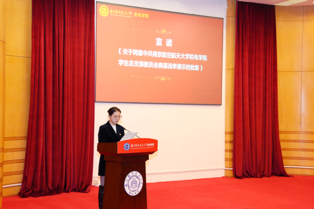 昂洋代表学院党委宣读《关于同意中共南京航空航天大学机电学院学生总支部委员会换届选举请示的批复》。