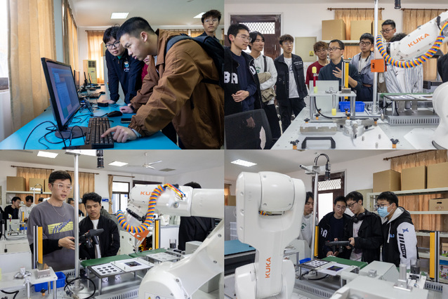 来自机器人技术实验室的王灵禺老师向同学们介绍了实验室主要研究方向,涵盖了机电控制及自动化、机器人与传感器技术等多个重要领域。通过实验室配备的KUKA机器人现场实际操作,向大家展示了该机器人的轻量、高扭力、强韧性等特点以及其广泛的应用领域。同时,同学们体验了供科创竞赛使用的机器人设施,感受到了学院为学生提供的良好学习与科创环境。