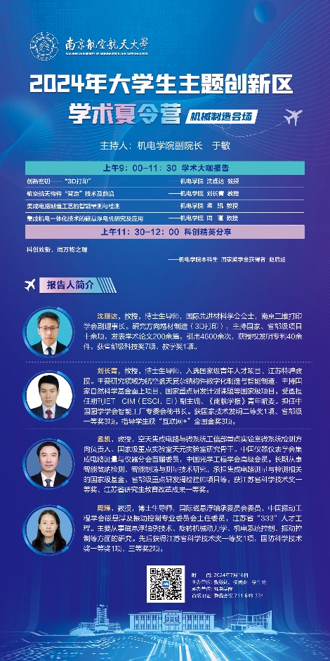 本次学术夏令营邀请了机电学院沈理达、刘长青、孟凯、周瑾四位教授,以及一名优秀本科生赵启超,分别对各自的科研成果和学习经验进行了分享。