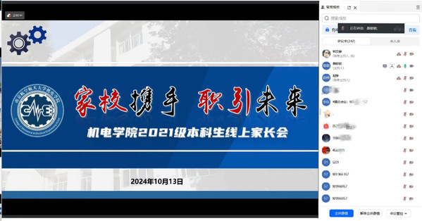 为进一步加强家校沟通,促进家校协同育人,提高学生就业升学积极性、主动性,10月13日,机电学院召开“家校携手 职引未来”2025届本科毕业生线上家长会。学院党委副书记赵铮、毕业班辅导员聂敏敏、王曦以及200余位学生家长共同参会。