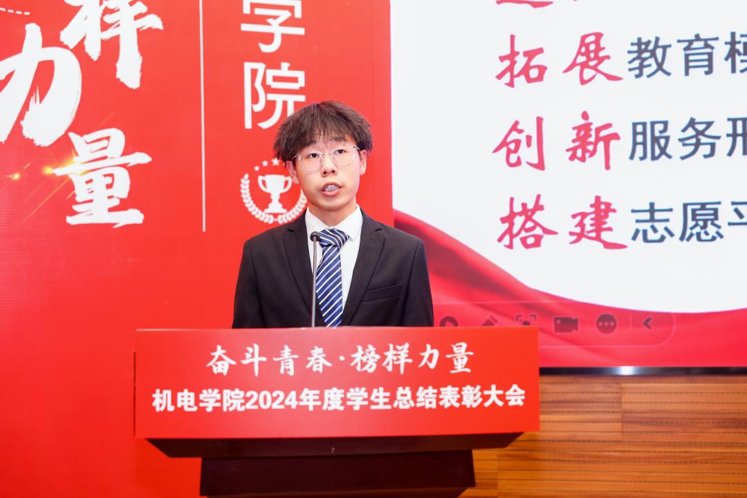 最后,刘虎对本次表彰大会致辞。他表示,今天的表彰大会,不仅是一场朋辈引领的榜样事迹分享会,更是一堂筑梦育人的思政公开课。他对同学们提出了三点要求:要坚定理想信念、厚植家国情怀,要坚持科技创新、练就过硬本领,要矢志拼搏奋斗、勇担时代重任。他强调,新时代呼唤新作为,新征程须有新担当,希望机电学子在推进强国建设、民族复兴伟业中展现青春作为、彰显青春风采、贡献青春力量。