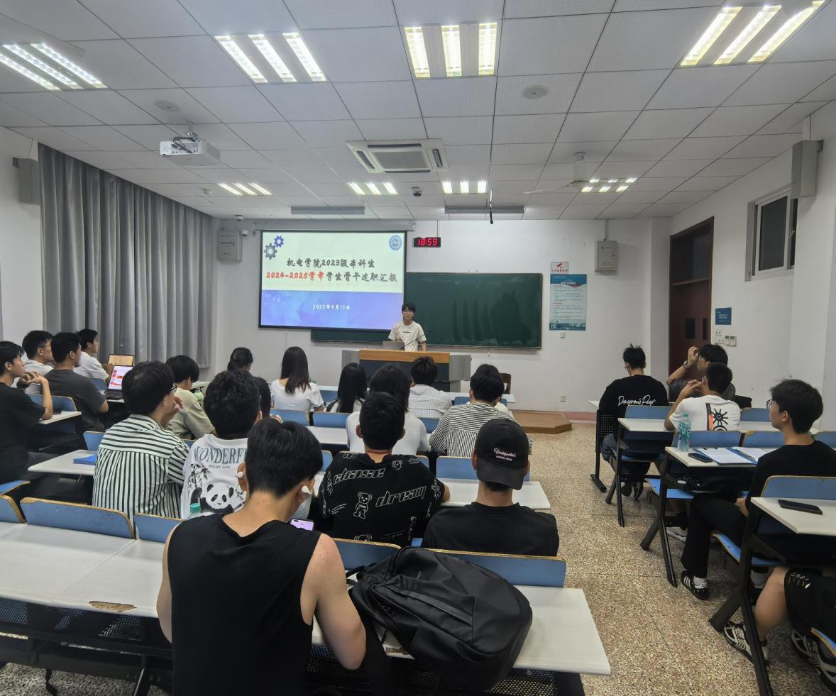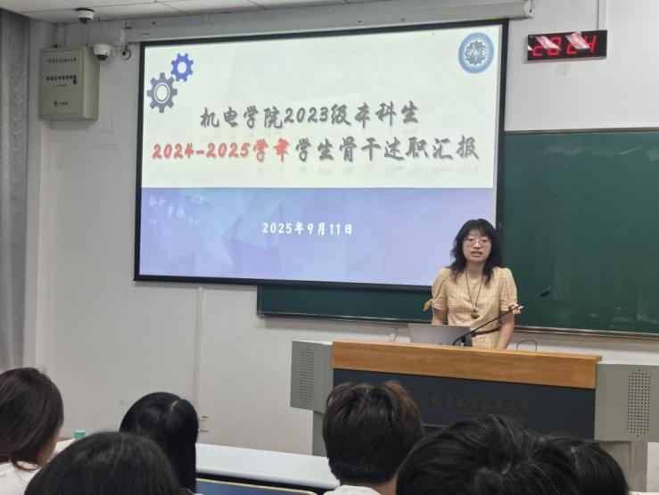 为总结过去一学年各班级的学生工作开展情况,加强班团组织建设,提升学生骨干履职能力,9月11日,机电学院2023级本科生辅导员刘梦嘉、于婧怡共同主持召开了2024-2025学年学生骨干述职大会。机械工程、工业设计、机器人工程以及智能制造工程专业16个班级的学生骨干代表依次上台,就过去一学年的学生工作与班级建设情况进行了全面汇报。