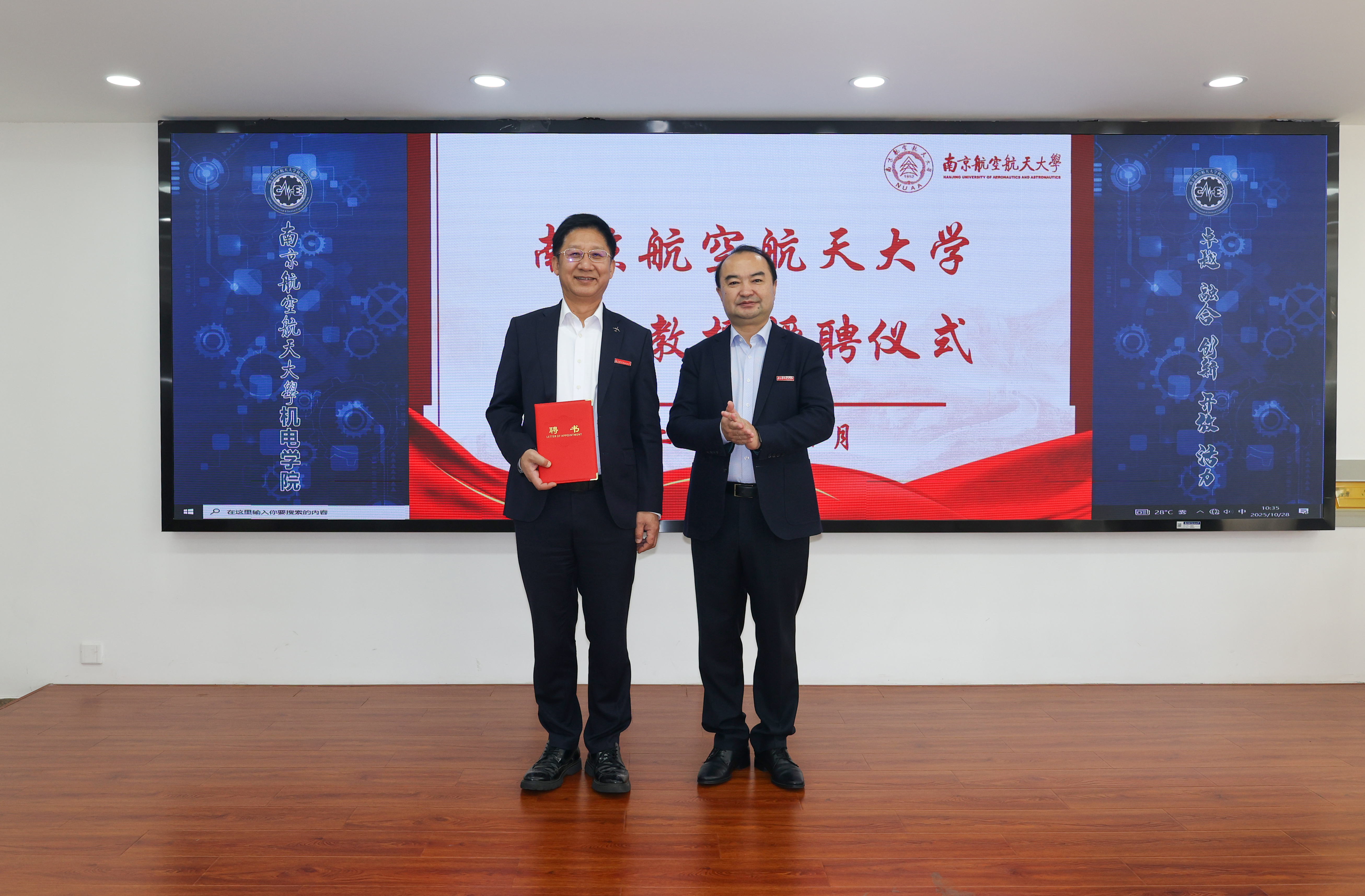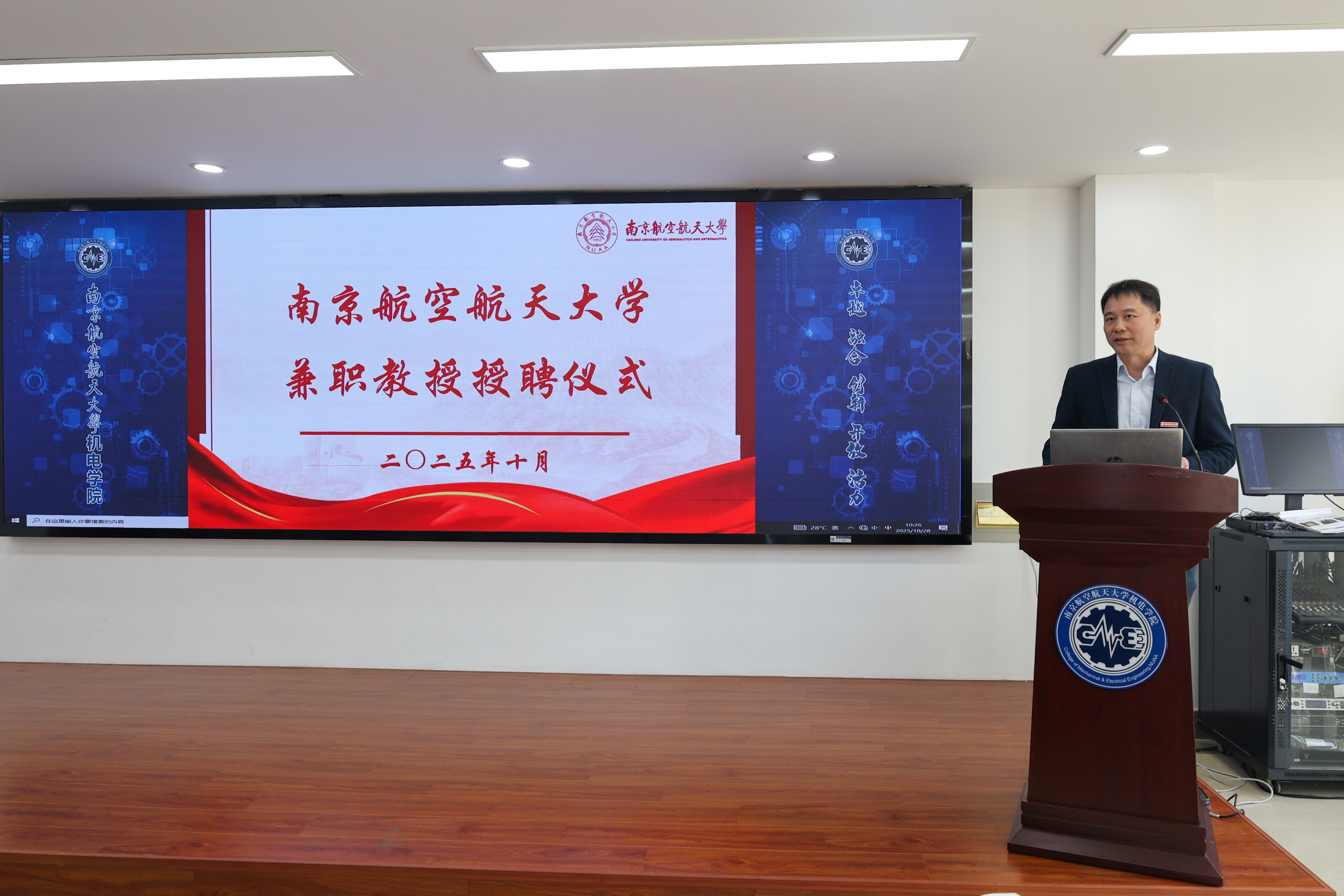 10月28日,我校在明故宫校区举行邓玉东研究员兼职教授授聘仪式暨“民用飞机装配集成先进技术联合实验室”揭牌仪式。1987级校友、中航沈飞民用飞机有限责任公司(以下简称“沈飞民机”)党委书记、董事长邓玉东,副总工程师杨波,规划发展部部长戴天,制造技术副总工程师贾晓亮,供应链管理部副部长赵敏,我校党委副书记陶勇、发展规划与学科建设处处长田威、科学技术研究院专务梁文萍、人才办公室副主任赵海燕以及机电学院党委书记刘虎、党委副书记赵铮等多名师生代表参加仪式。仪式由刘虎主持。